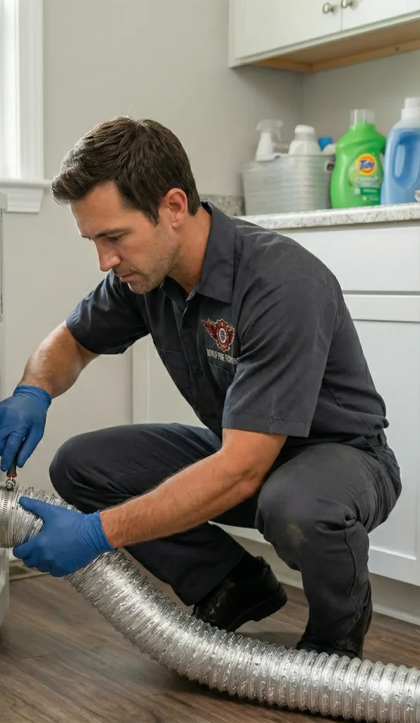We clean the vent line and the internal dryer cavity, where lint and heat meet.