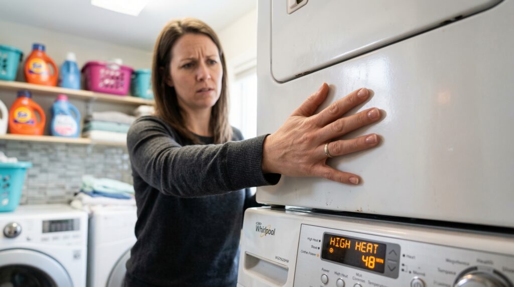 The dryer feels hot to touch after each cycle. The clothes come out hot too. Heat has nowhere to escape. This stresses your machine. It wastes power and risks fire.