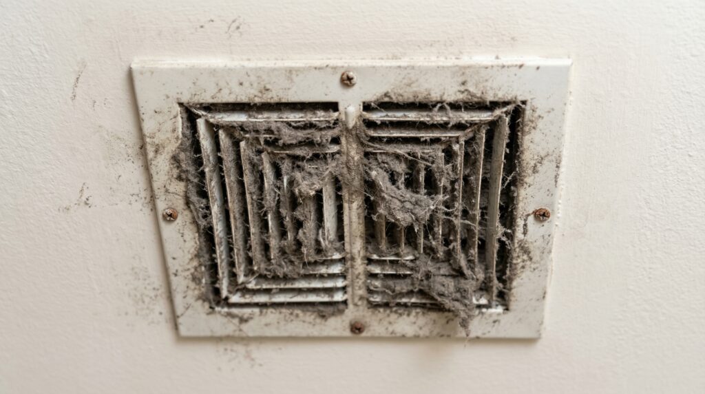 Thick dust coats the vent grilles. You see buildup on fan covers. The system pulls dust through your home. Air quality suffers silently.
