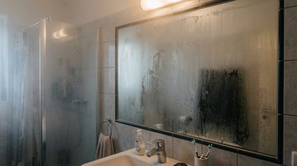 Steam hangs in the bathroom after showers. The mirror stays fogged for hours. The exhaust fan runs but does not clear air. Weak airflow means blockage inside.