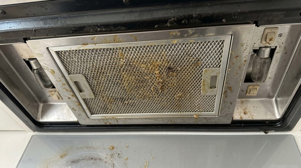 The range hood filters look clogged and yellow. Grease drips from the hood surface. Cooking smoke does not clear. The vent cannot exhaust properly.