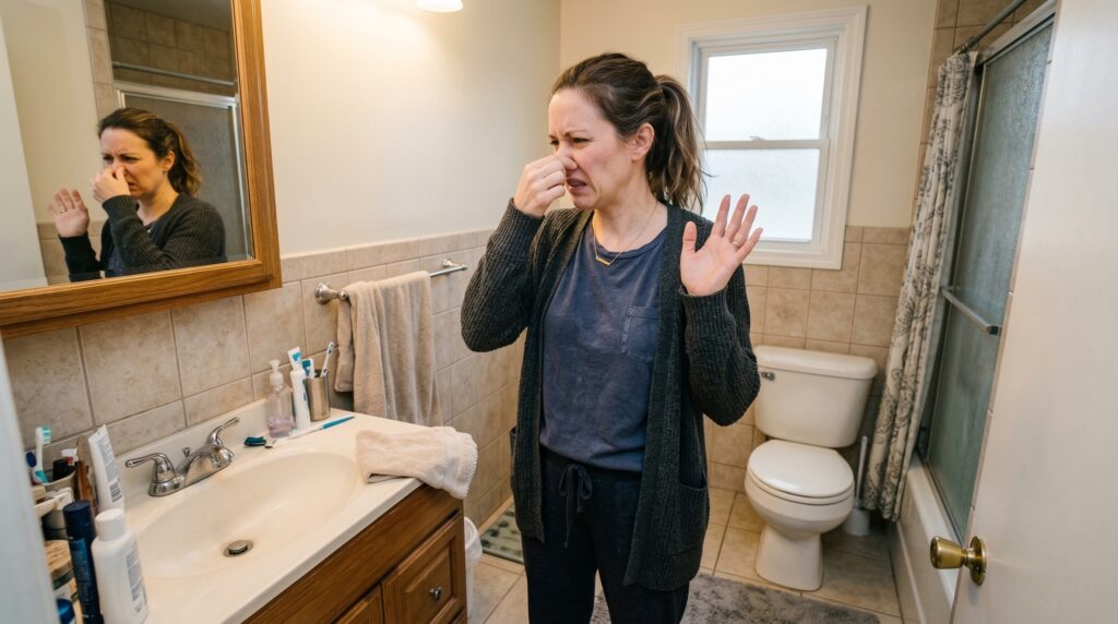 Your bathroom smells musty or moldy. Moisture stays trapped in the duct. Bacteria grows in the damp dust. The vent blows odors back into rooms.