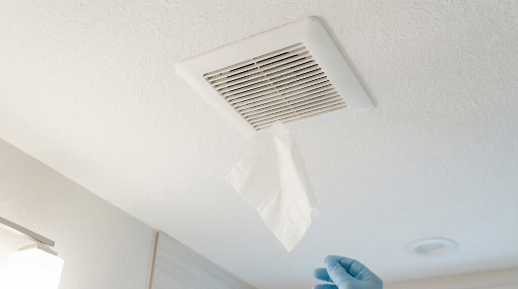 The bathroom fan sounds loud but moves no air. Toilet paper does not stick to the grille. The motor works harder each day. Dust blocks the fan blades.