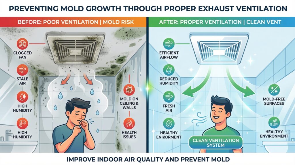 Mold grows in moist bathroom ducts. Kitchen grease creates fire risk. Dust reduces airflow and strains motors. Air quality suffers.